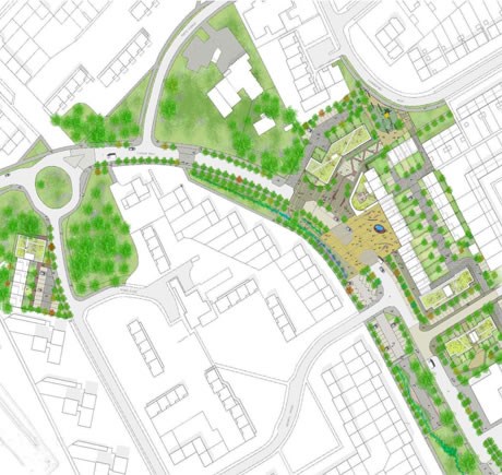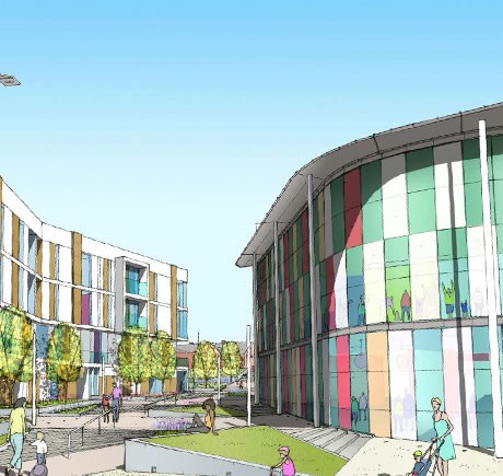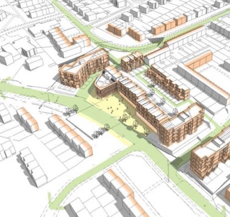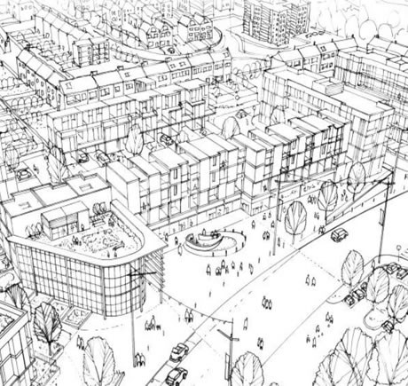 A concept proposal for the regeneration of an existing local district centre to provide new local commercial and community facilities along with providing a fresh approach to living accommodation with high quality apartment and family dwellings.