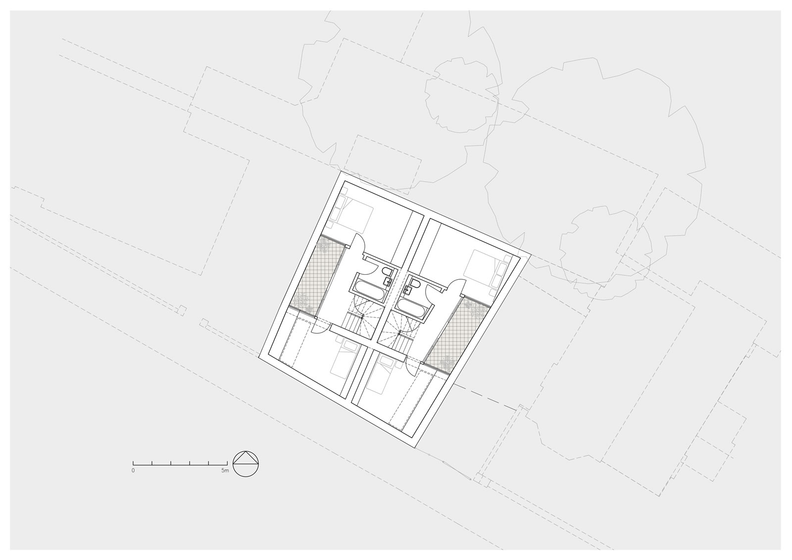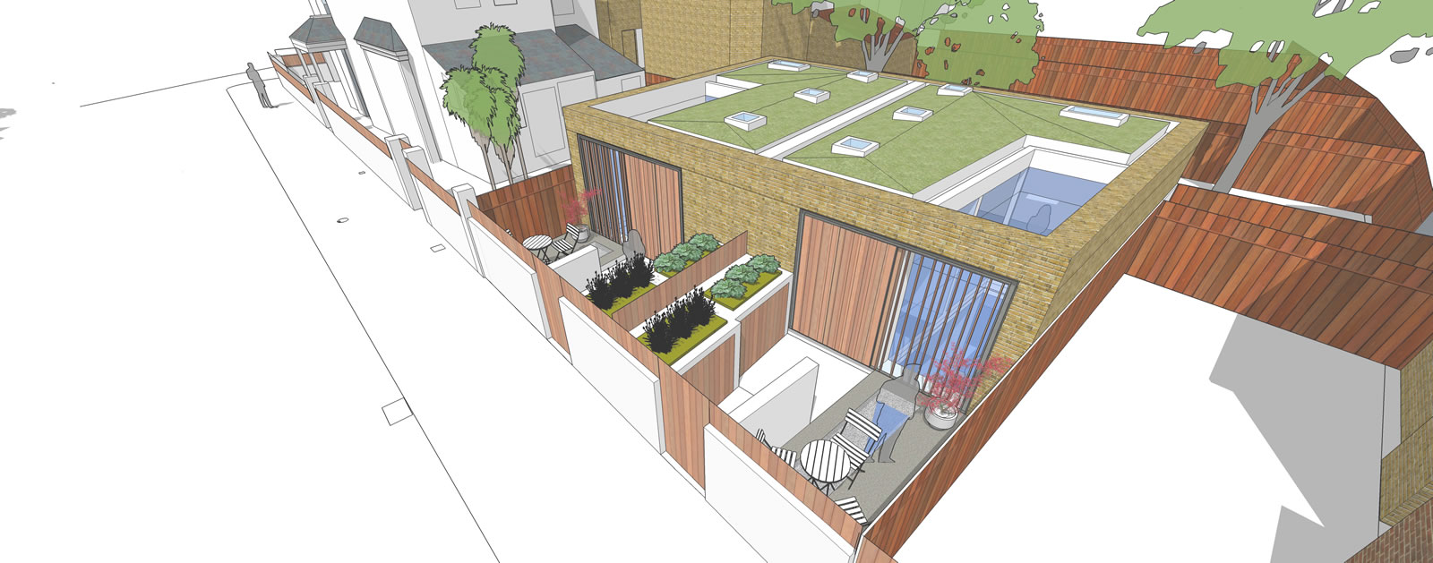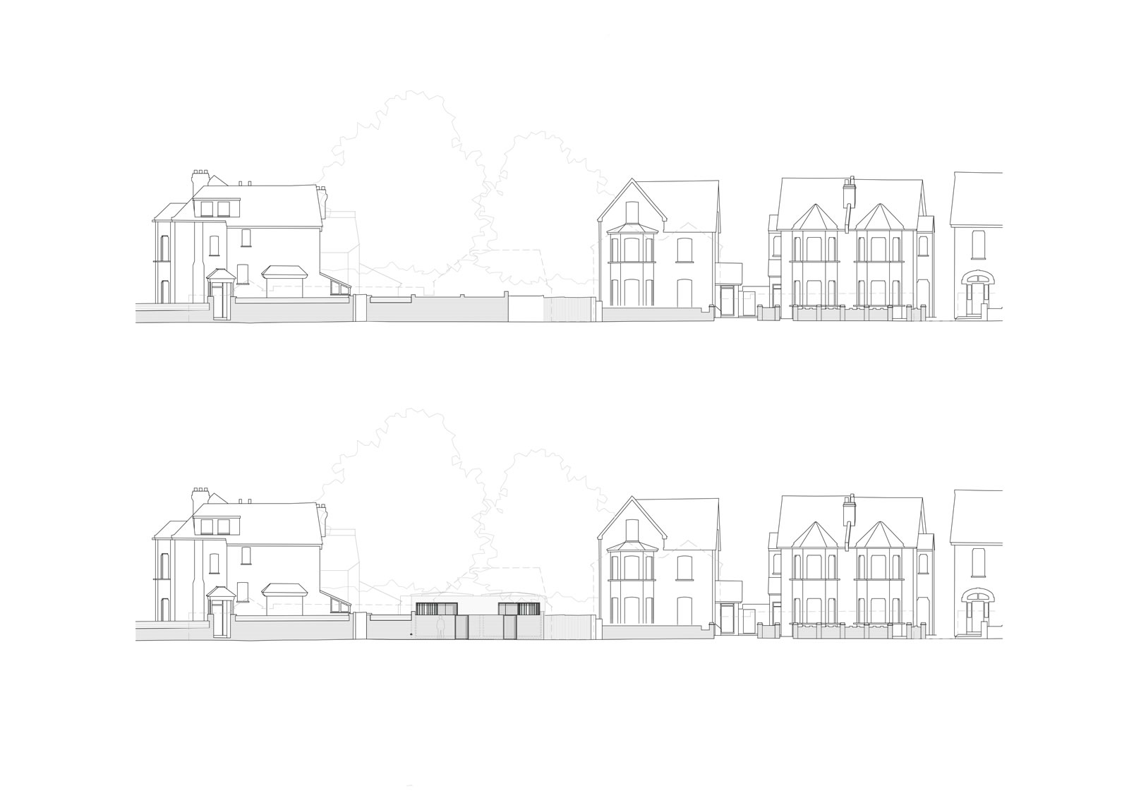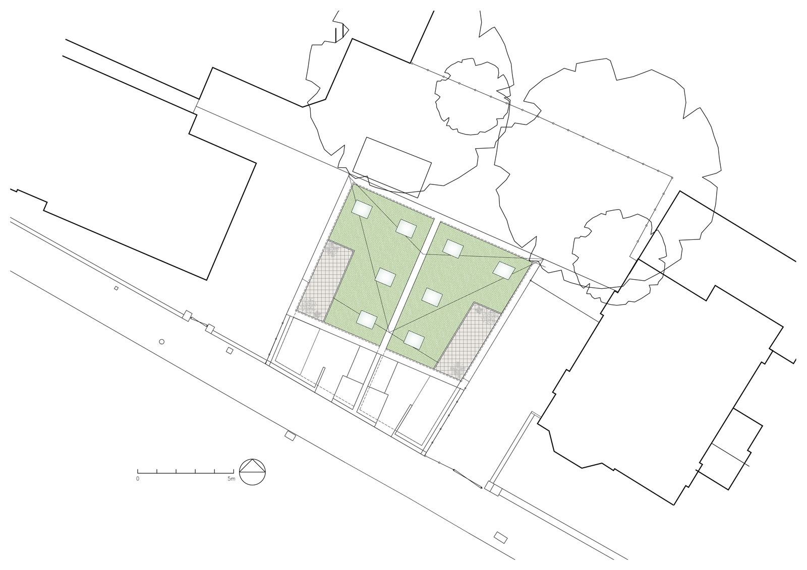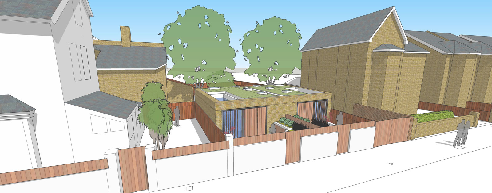 Proposed development of rear garden of a corner plot to create two new 2 bedroom dwellings. Informed by a detailed assessment of the existing context and surrounding character, scale and form, the innovative design approach, reflecting the scale of a single storey garage block to the rear garden, created new dwellings with central light shaft and contained front garden creating surplus levels of private amenity and good levels of natural daylight.