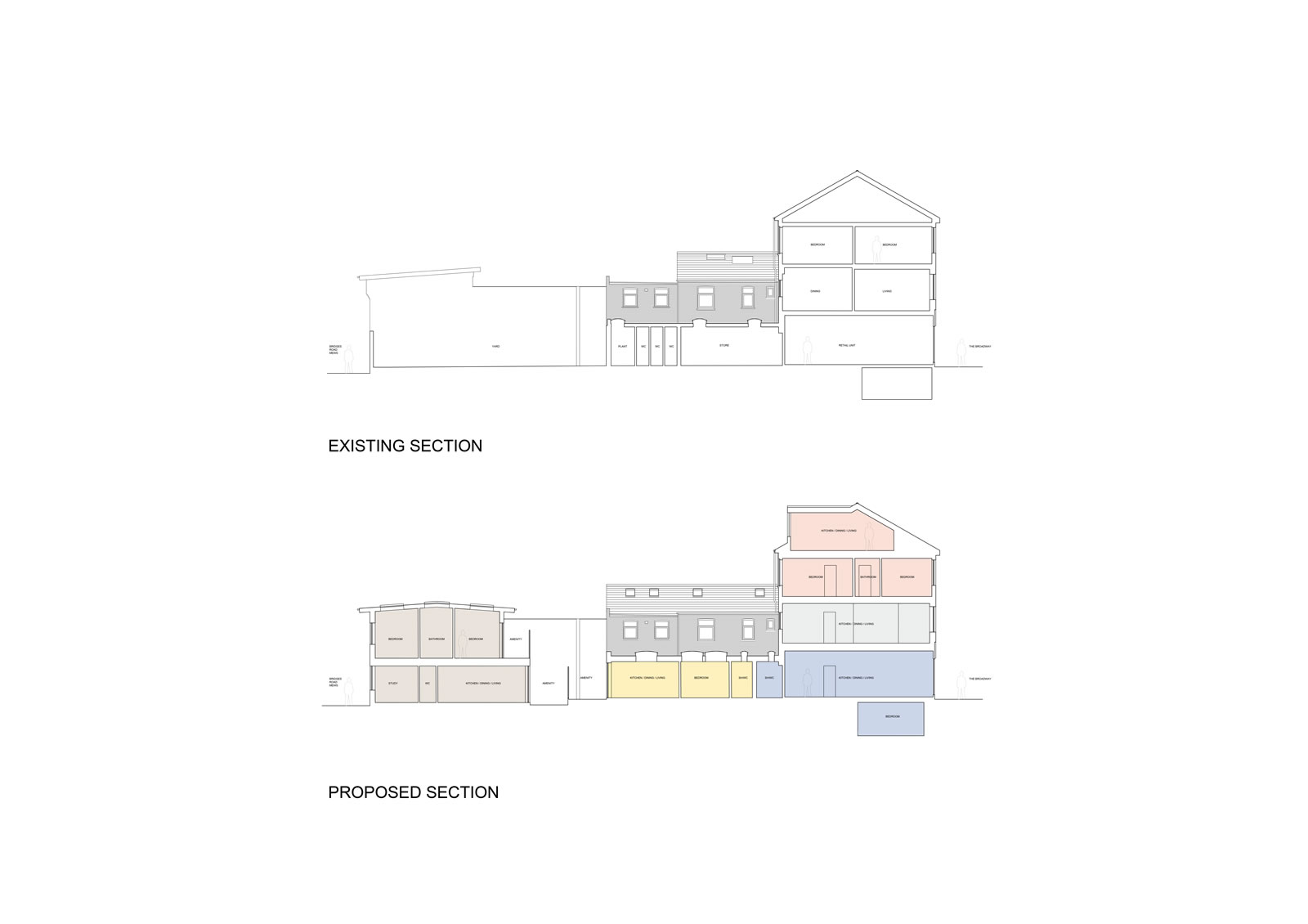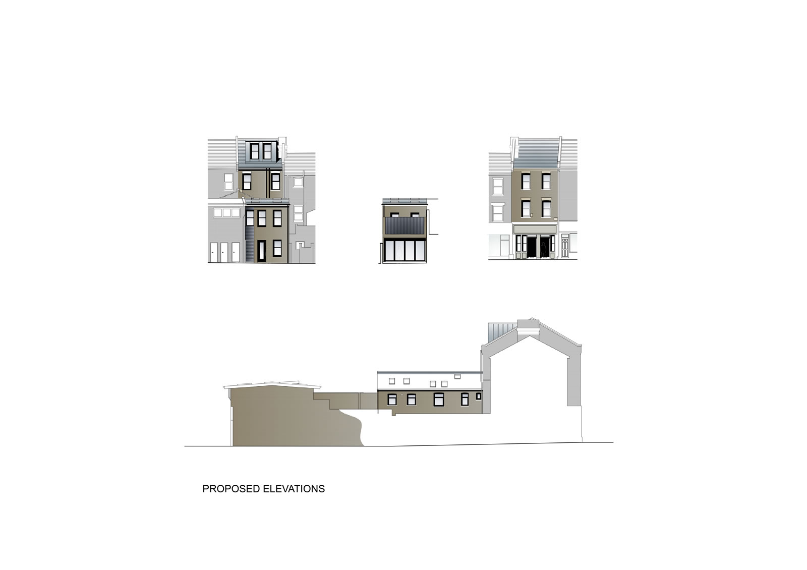 Conversion of existing retail with single residential unit above into 5 residential dwellings. Obtaining planning approvals and detail design for conversion of existing into one studio duplex (including basement conversion), one 1 bed flat and two 2 bed flats along with development of new build two-storey 2 bedroom dwelling accessed from mews to rear.
