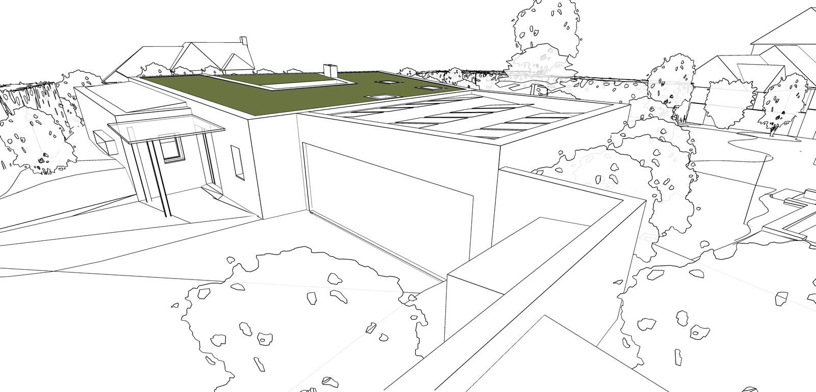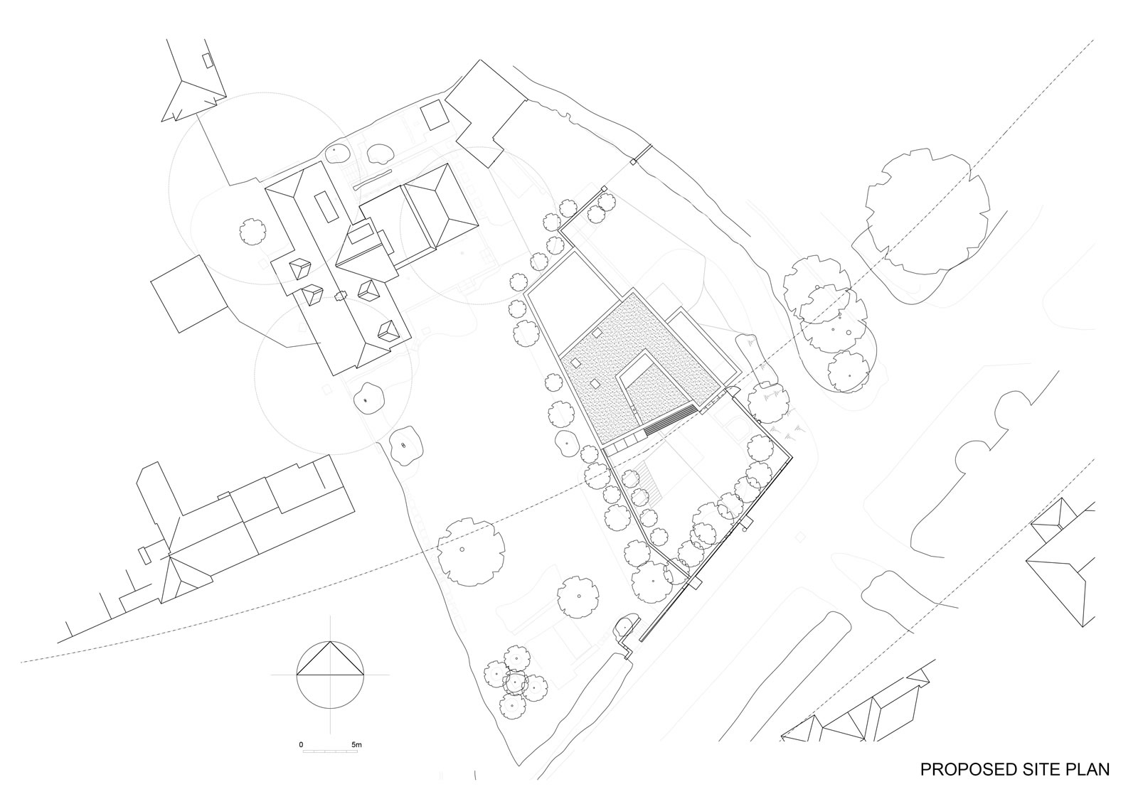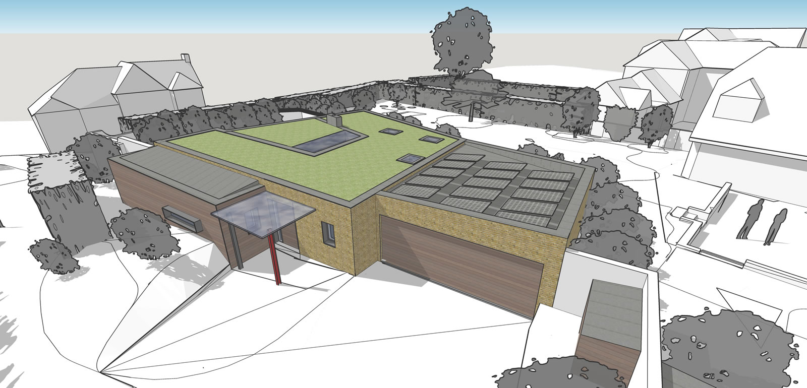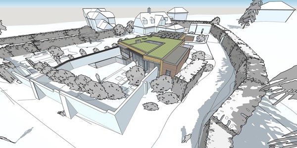 Development within garden of existing retained dwelling to create dream home incorporating sustainable design to future proof for senior age living and to minimise carbon footprint and dependency upon fossil fuels. Proposed new build dwelling arranged over two floors as a sunken earth dwelling with 3 bedrooms and garaging for two cars as well as an open plan kitchen, dining and living space benefitting from far reaching views.