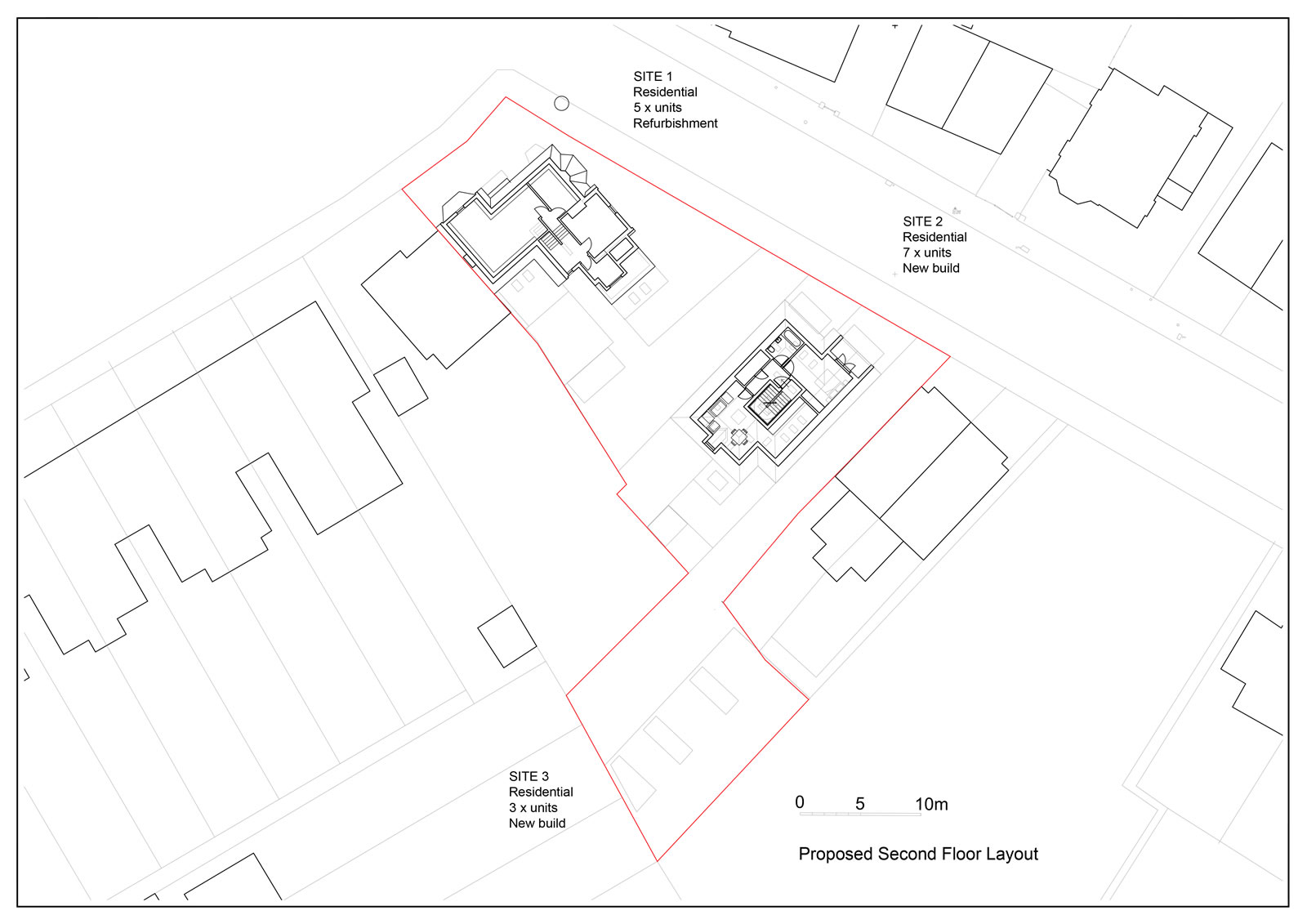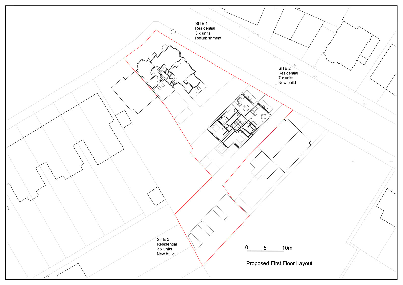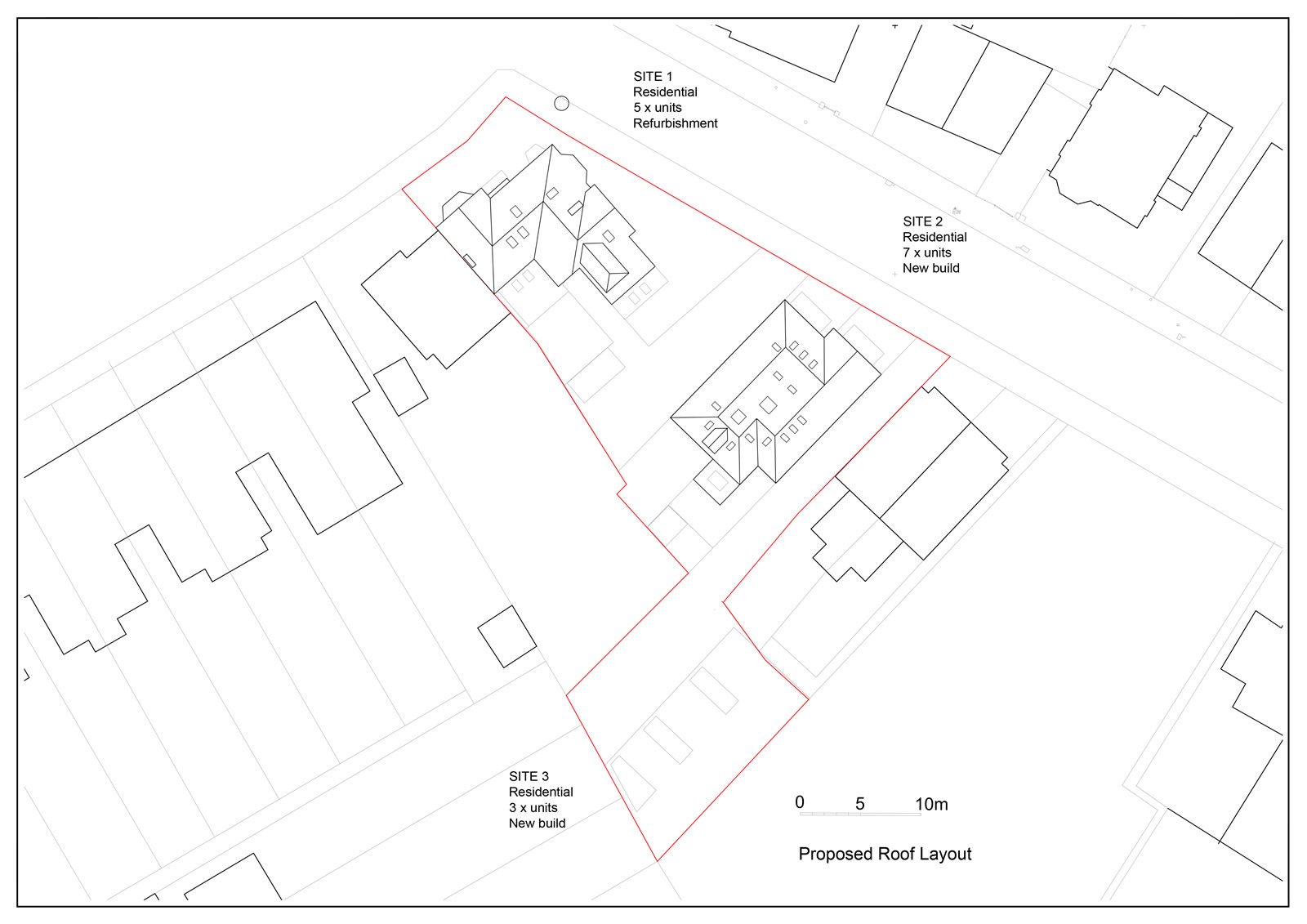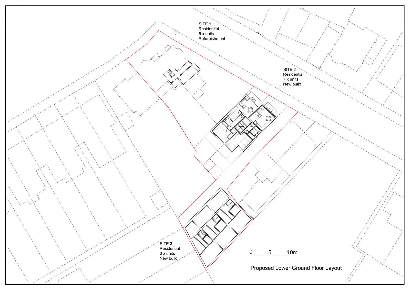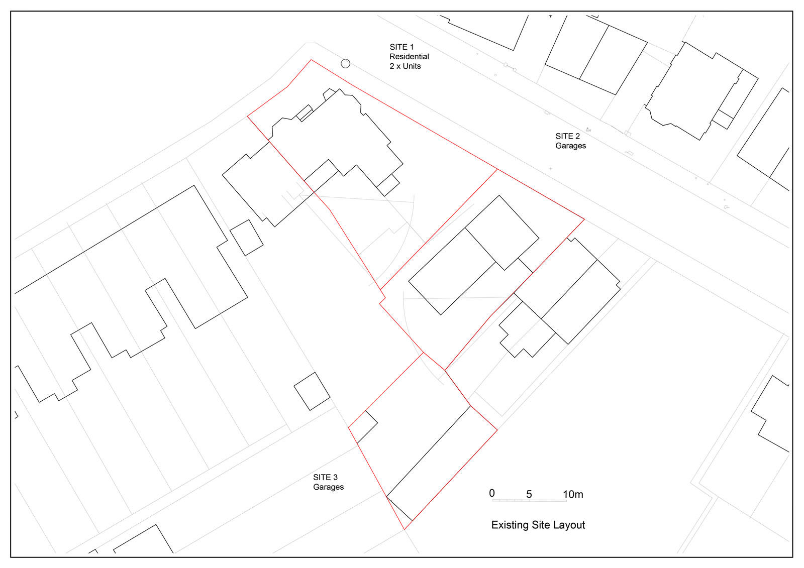 Concept design to assess options for redevelopment of brownfield land occupied by garages and rear garden with new build infill development to optimise potential value through creation of 10 new dwellings as range of innovative duplex and flats. Proposals also included the extension and refurbishment of an existing residential property consisting of two apartments, to increase the number of residential units to 5 units to increase the potential rental income.