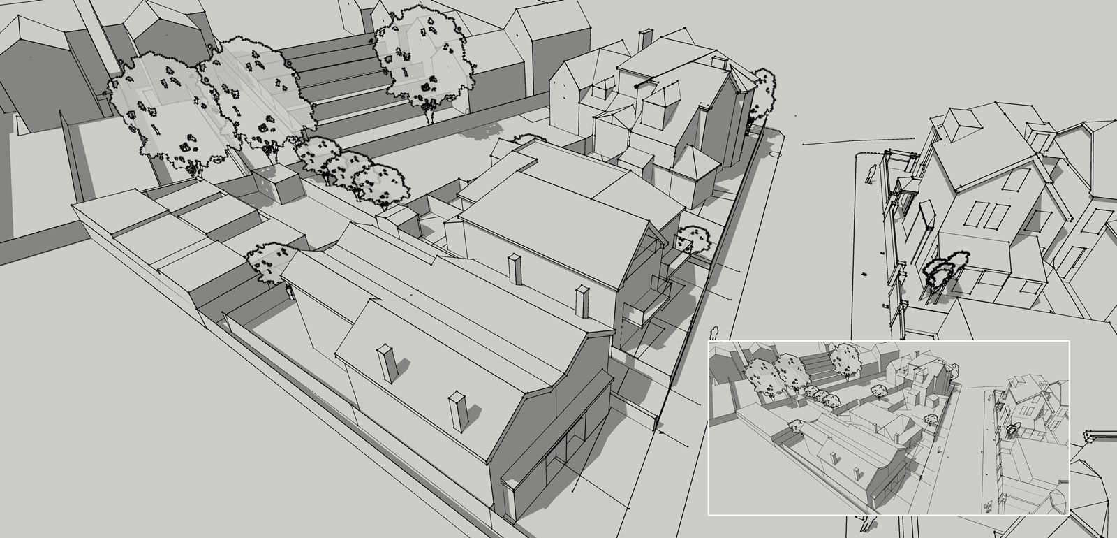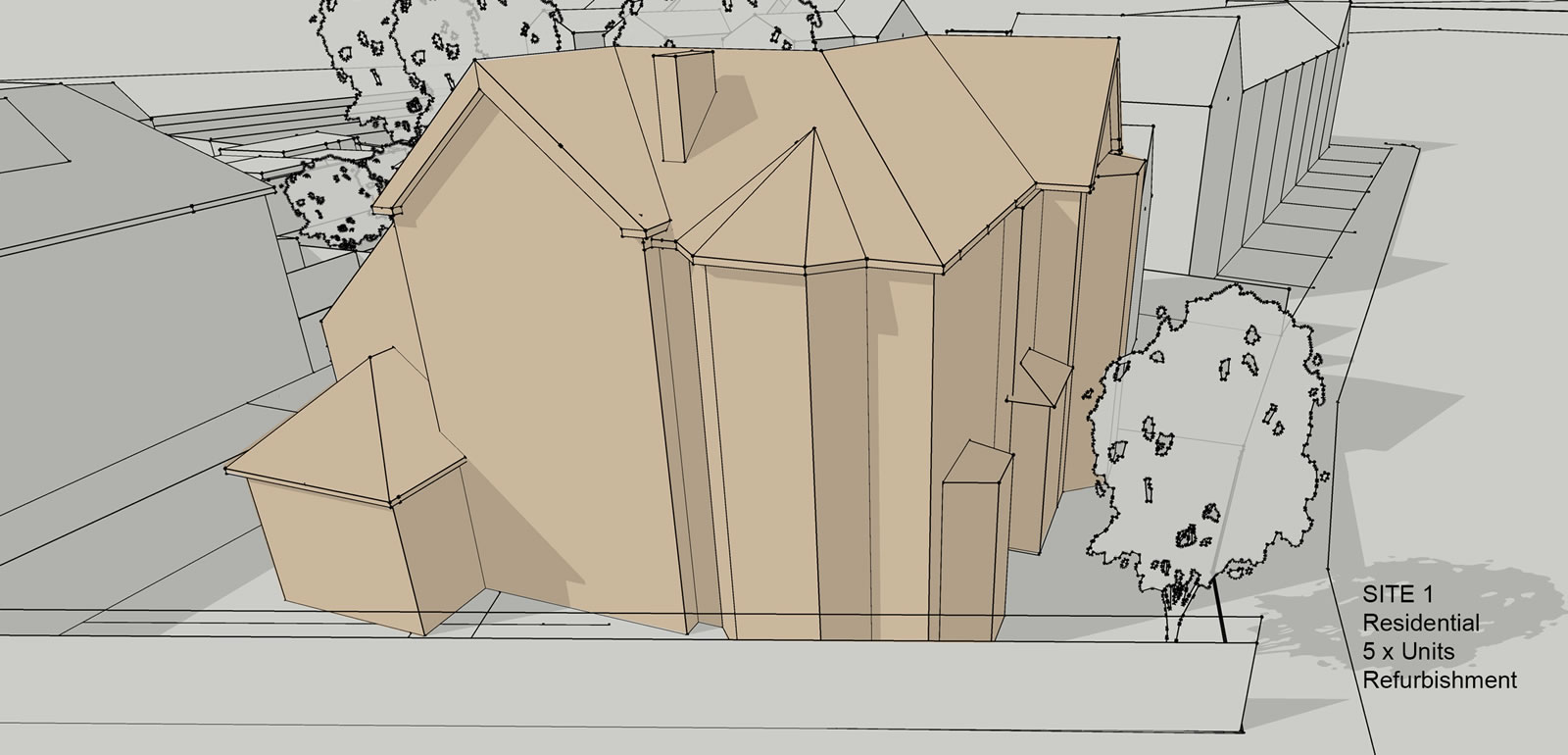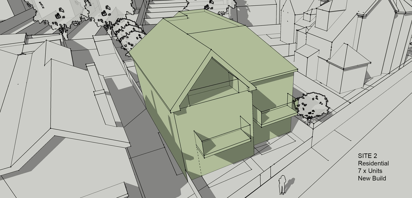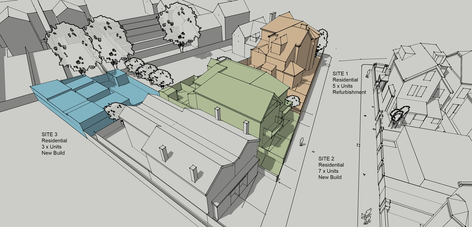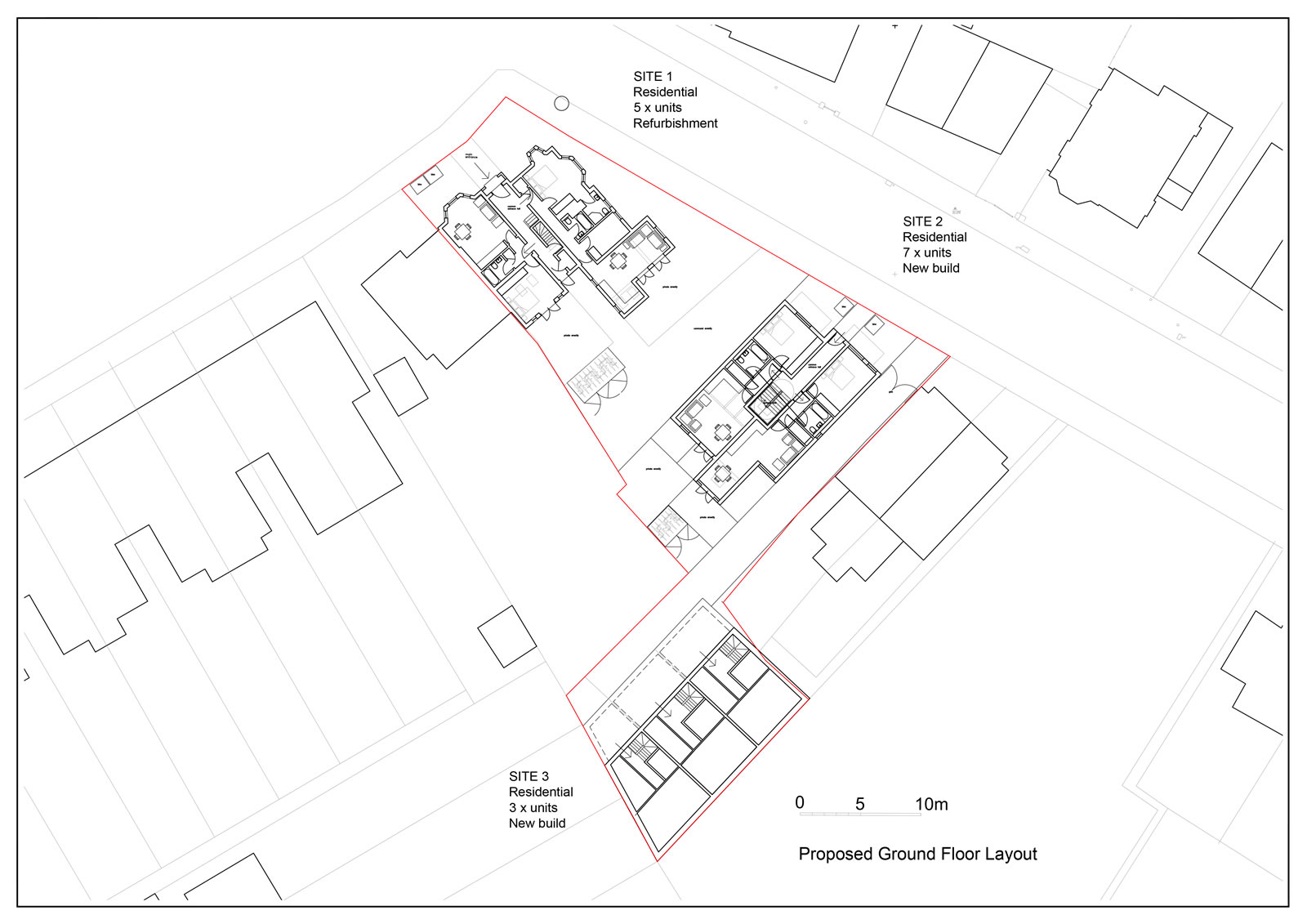 Concept design to assess options for redevelopment of brownfield land occupied by garages and rear garden with new build infill development to optimise potential value through creation of 10 new dwellings as range of innovative duplex and flats. Proposals also included the extension and refurbishment of an existing residential property consisting of two apartments, to increase the number of residential units to 5 units to increase the potential rental income.