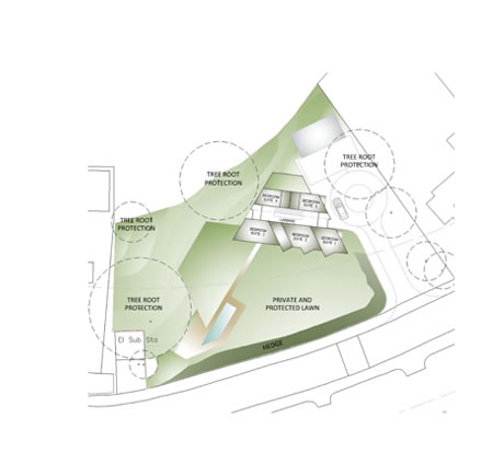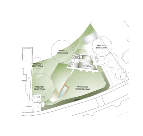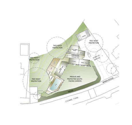 To create a new 8,000sqft contemporary dwelling working with the topographical and arboricultural conditions of the existing site. Resolution cuts the proposal into the slope to create additional level garden area whilst also opening out the primary living spaces to the views and southerly aspect.