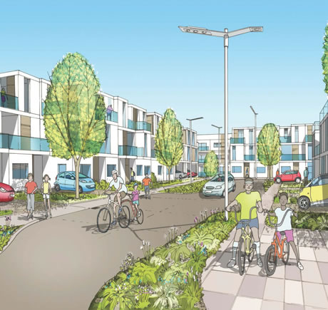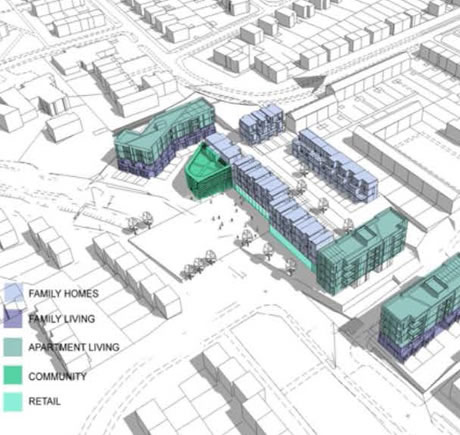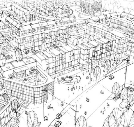 A concept proposal for the regeneration of an existing local district centre to provide new local commercial and community facilities along with providing a fresh approach to living accommodation with high quality apartment and family dwellings.